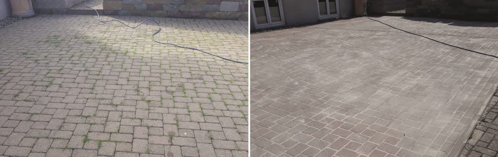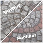 Unkraut in den Fugen? Fläche gereinigt und Fugen wasserdurchlässig „unkrautdicht“ gemacht.