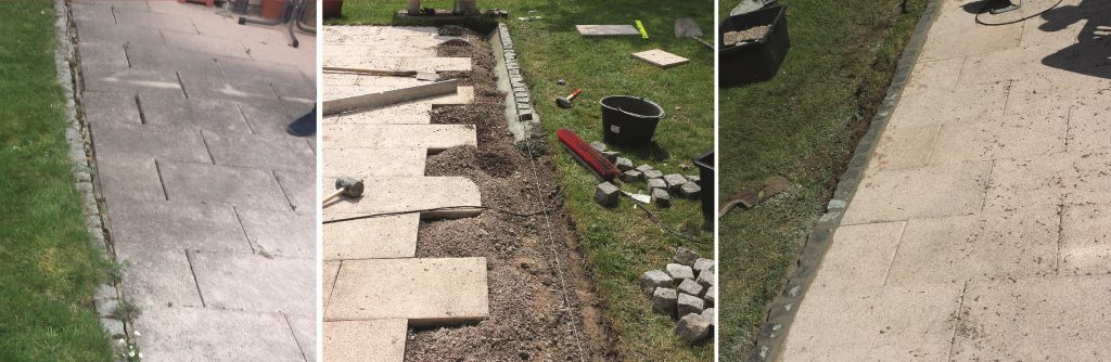 Pflastersteine waren abgesackt, fehlende Begrenzung. Einbringen einer Begrenzung, Steine frisch gesetzt.